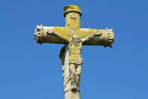 Sur la gauche de la reproduction de la grotte de Lourdes, se dresse une grande croix de pierre. Sur le socle est posé un...