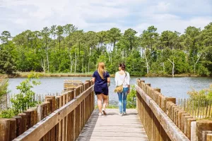 Les promeneurs peuvent s’avancer sur le Bassin d’Arcachon en empruntant la jetée d’Arès. Long chemin de pierre cimenté...